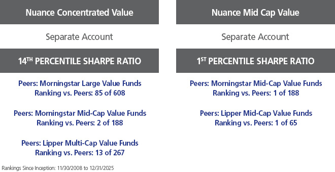 Additional Information: Portfolio composition will vary over time and may change without notice. Over the product life, the Concentrated Value Separate Account Product has been classified by Morningstar in the following categories: Large Value and Mid-Cap Value. Over the product life, the Mid Cap Value Separate Account Product has been classified by Morningstar in the following category: Mid-Cap Value. Lipper does not provide product level classifications. Current investment style and assigned peer groups may differ from the styles presented. Nuance utilizes fund peer groups due to the limited availability of separate account data. The Composites are compared to various fund peer groups as defined by investment style and are constructed in a manner that is similar to the guidelines and classifications of the Morningstar and Lipper fund category groups to which they are compared. However, fund category groups differ from separate account category groups. Morningstar Categories are based on the average holdings statistics over the past three years and are applied both funds and separate accounts. Morningstar Style Box Methodology is based on growth versus value scores using historical measures of various portfolio components and weights. A complete description of Morningstar’s Category classifications and Style Box Methodology can be found at https://www.morningstar.com/research/signature. For Morningstar ratings of our separate accounts, please visit: https://nuanceinvestments.com/awards/. Lipper’s Fund Classifications have a prospectus-based methodology with diversified funds having an additional portfolio-based classification and are applied to open-ended funds but not to separate accounts. A complete description of Lipper’s fund classification methodology can be found at https://lipperalpha.refinitiv.com. The number of peers (i.e., the ranking) includes only those Category Peers with similar return timeframes to the Composites. For the purposes of peer group comparisons, Since Inception returns are shown beginning 11/30/2008. Standard Deviation is a statistical measure of the historical volatility of a portfolio that reflects its dispersion or deviation from its mean. The Sharpe Ratio is a calculation of a product’s risk-adjusted performance over time. The Ratio is calculated by taking a product’s annualized excess return over a risk-free rate (The Firm uses the Citigroup month Treasury Bill as the risk-free rate) and dividing by its annualized standard deviation calculated using monthly returns.